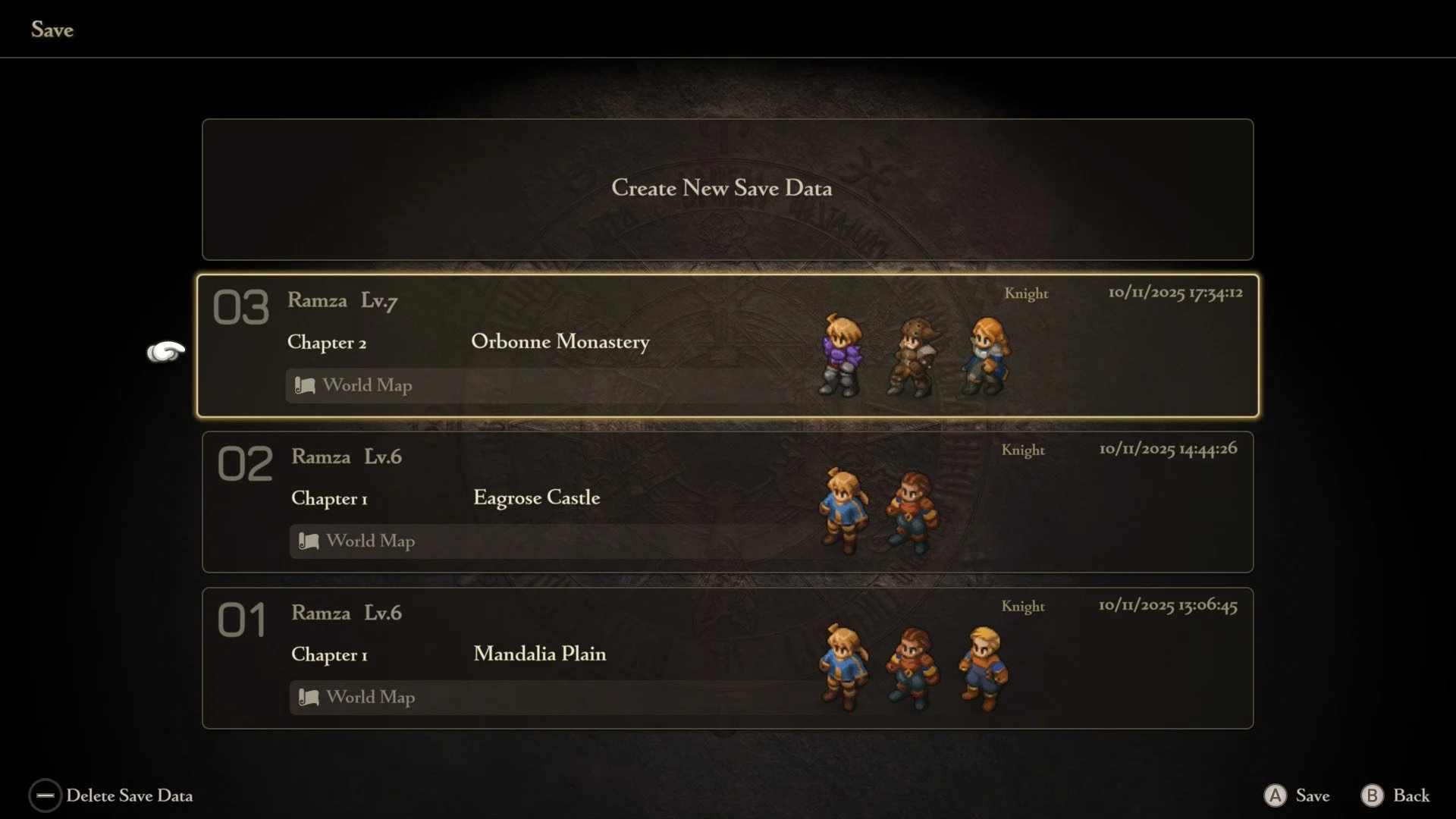 Second, the save states are super generous. The game constantly auto saves (even keeping multiple saves in its recent memory) and gives you multiple manual save slots you can use any time outside of battle