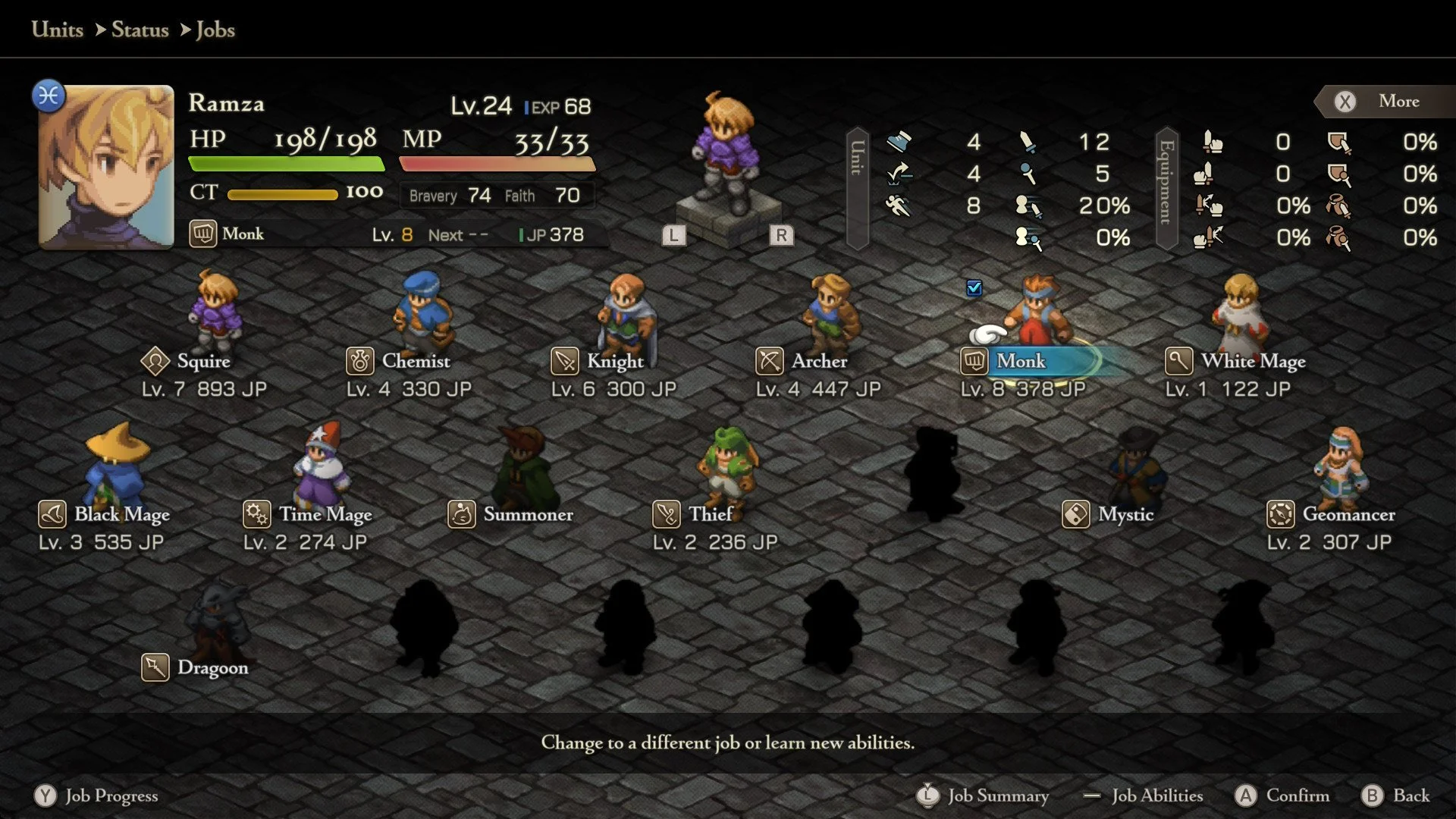 Further improvements to the menus that show how changing a unit’s job and/or gear affects stats. I know they’ve already brought the job tree forward as an addition to this version, but it does feel like there could still be a better way to show players how to interact with the job system, plan their progression, and grind/work towards that efficiently