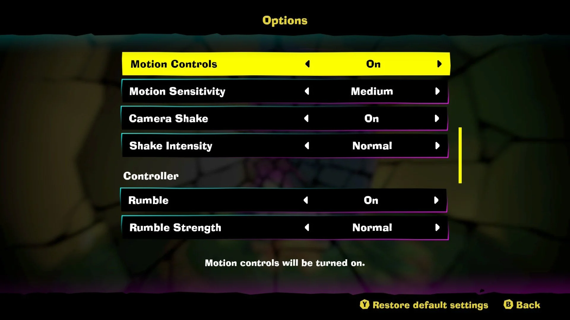 Screen shot of Bananza's system menu, showing options for motion controls, camera shake, and rumble