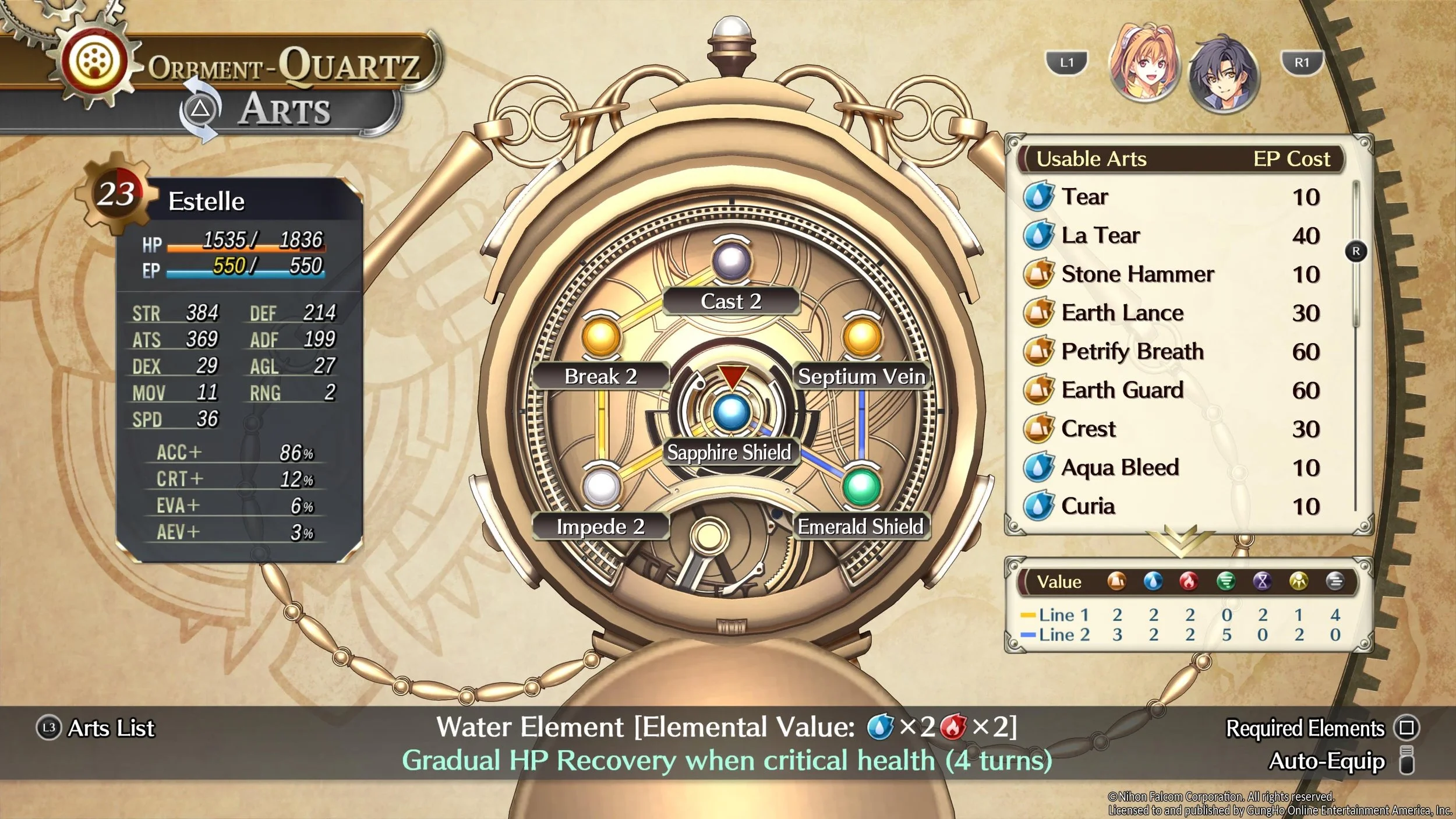 Orbments: Orbments are the Trails equivalent to FFVII’s materia if you’re familiar with that. Basically, you slot different types of elemental quartz into your characters’ gear. Each quartz has an associated elemental value on top of its core effect (so a fire quartz might buff your attack or crit rate, while a wind one could buff your evasion). Hitting certain thresholds for each element on a given line for a character is ultimately how you enable that character to access higher and higher level arts (aka spells). While it’s not the most complex RPG system ever, it can still be slightly obtuse for series and/or genre newcomers. I don’t think there’s an outright “fix” for this – BUT the game does offer an auto-equip option that should help in a pinch.