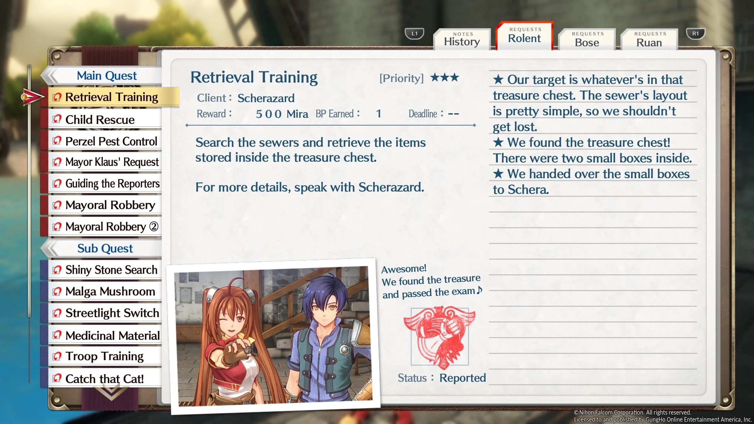 I’ve already mentioned the text log that saves recent dialogue and battle results, but Sky FC also does a great job with its quest logs, map design, and important event markers – all in service of helping guide players as much (or maybe even as little) as they need.