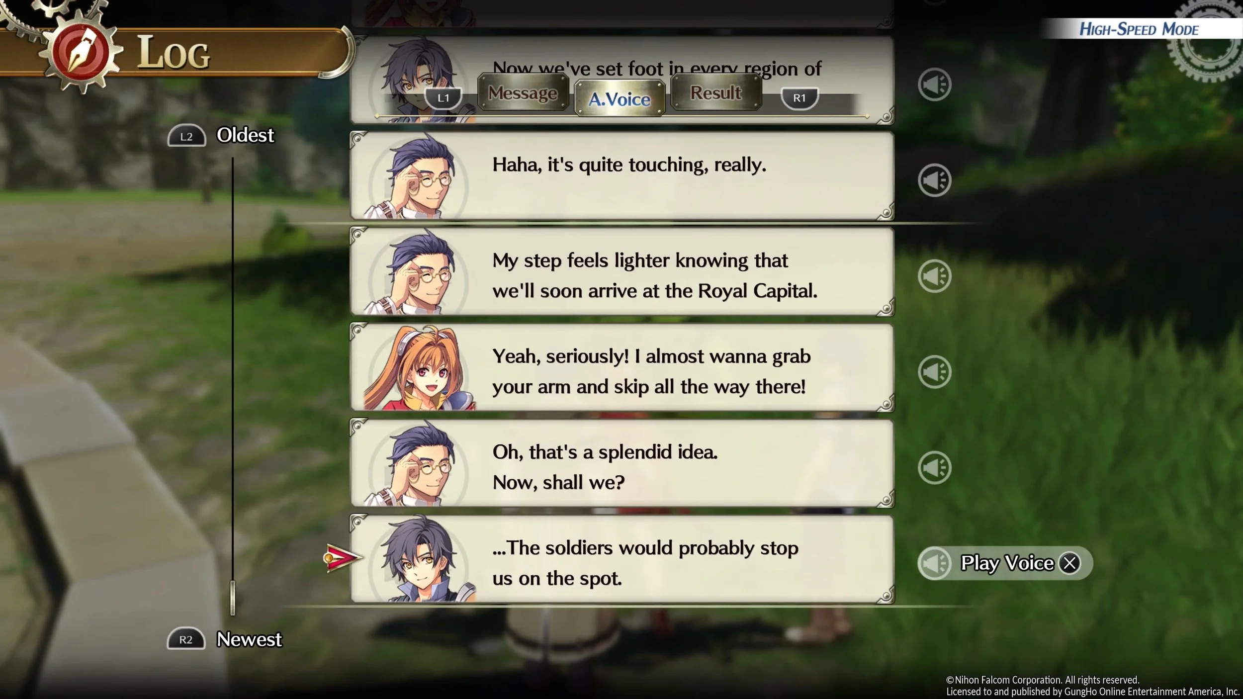 Not only does Sky FC offer this for its dialogue, it even includes the ambient lines of speech that characters say while running around the world (vs. in cut scenes) and saves your recent battle results screens for you to review in more detail too. This is phenomenal for letting players read at their own pace (going a step beyond the ability to turn off auto-advancing text lines). It even helps account for memory issues or environmental distractions that could cause you to miss a line of dialogue.