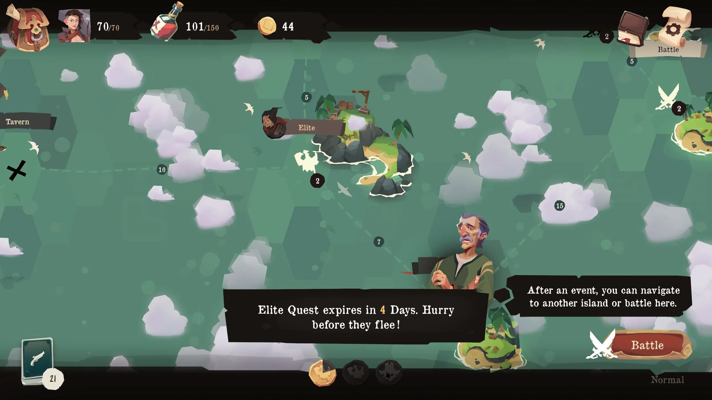 Pirate Outlaws played similarly to Slay the Spire: move up the board, face foes in a card battle to the death, and choose your next path after each victory. Pirate Outlaws 2: Heritage decided to throw that out the window (overboard?). You still move (I guess “sail” would be more accurate) on the map, but the movement is not a “climb” to the top; rather, it's just wherever you choose (between map points). You can literally sail back and forth between 2 stops over and over, if that is your fancy. Every few battles, though, an elite will spawn at a random location. It could be one stopover or three, depending on where you were on the map. Elites only remain in place for so many days (one day passes every time you sail to a new location), so you can elect not to face them by sailing to other spots, although you will miss out on superior loot rewards.